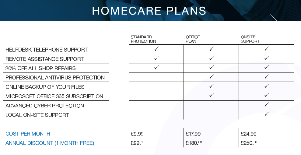 If you are a home user and need help with your computer, WiFi, printer, email etc – then you have come to the right place. We offer a series of packages for a small monthly fee allowing you professional support whenever you need it:
